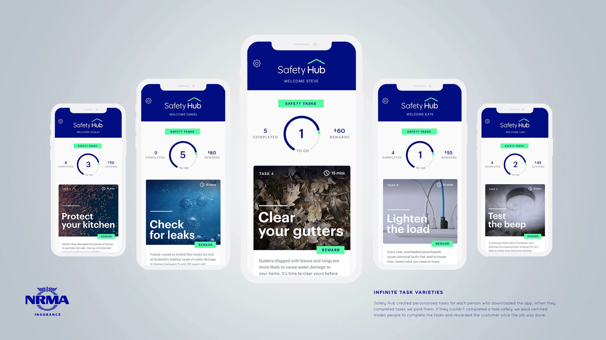 People only notice insurance when they need it, so it’s no wonder they begrudge paying their premiums. As a result, when it’s time to renew each year they’re often motived to find the cheapest insurance, instead of the best. But NRMA has over 90 years’ experience in managing risk, so they know which risks are the most common, which are the most disruptive, and which are the most preventable. For example, a flooded home can cost $20,000 to repair, but the most common cause - a burst ‘flexi hose’ - costs about $8 to replace. NRMA Safety Hub is a business innovation that flips insurance on its head. Instead of paying out after a disaster, it pays customers to take action to prevent it in the first place.