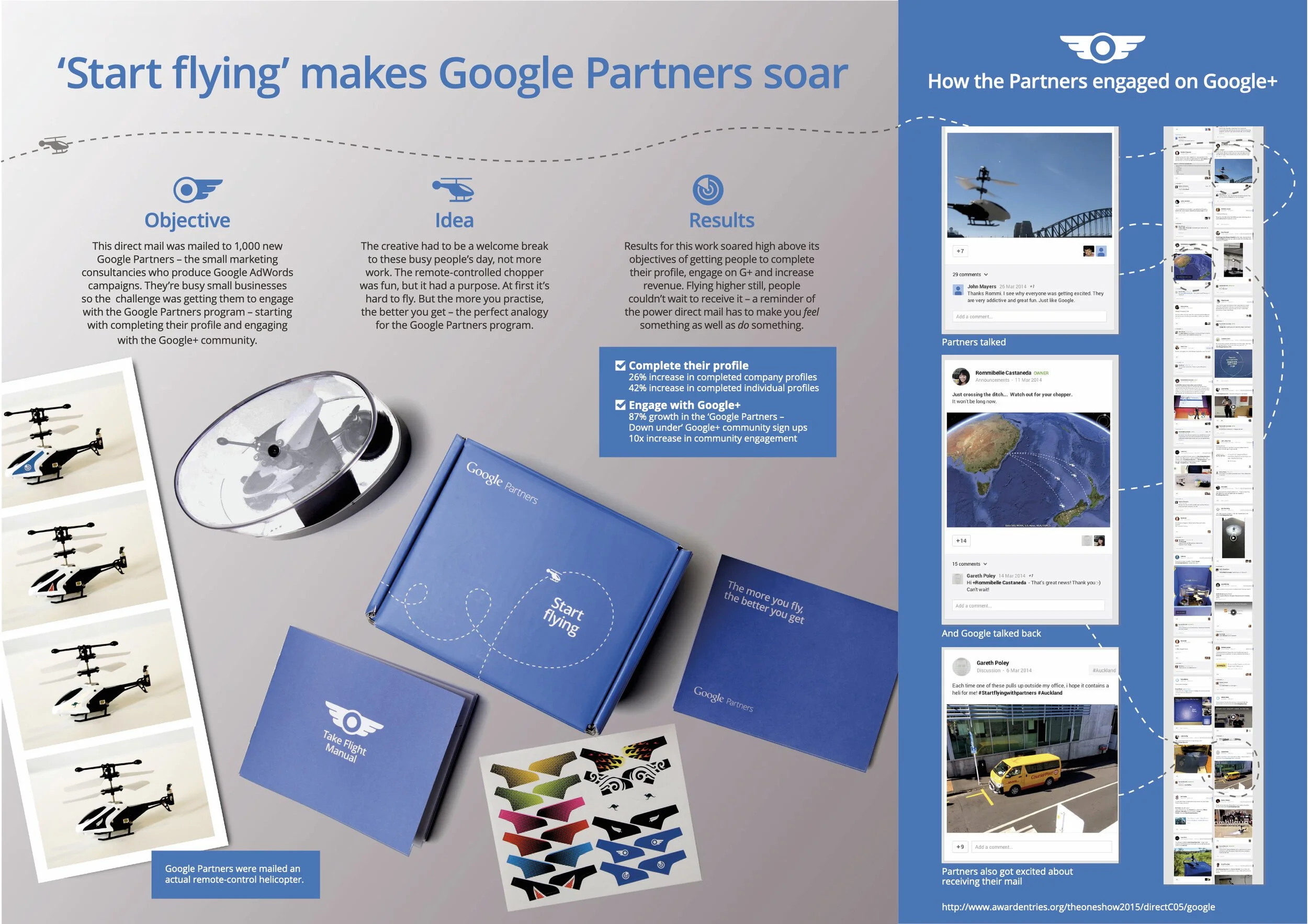 So Google mailed Partners a remote-controlled helicopter. Because it was hard to fly, it had a clear analogy with the Google Partners programme: the more you practice the better you get. Similarly, with Google Partners: the more you put in, the more you would get out.